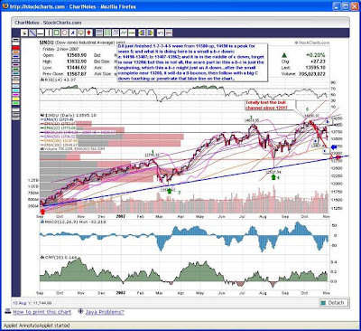 Yesterday, the market went down more than 100 pts. It is a sizable down. Today, the future is down a lot. The current correction wave of A-B-C is starting at B wave down. The current A wave up in S&P is 1400-1370 = 130 points. The B correction is looking at 38.2% of 130 pts, which is, S&P at 1350 level.